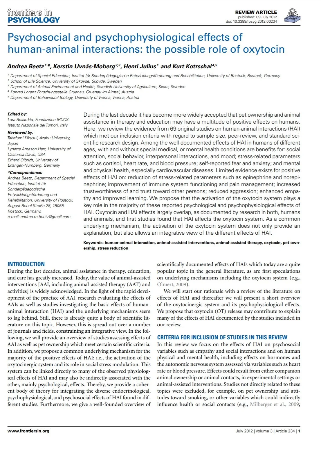 “The effects of oxytocin and of human-animal interactions largely correspond. Both, HAI and OT, were found to promote social interaction, to reduce stress and anxiety, and to enhance human health.”